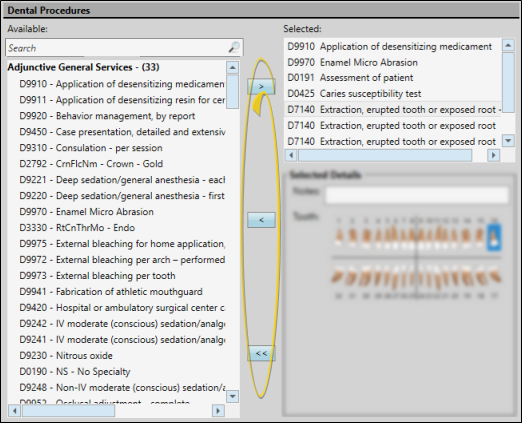Add / Remove Procedures - All of your Dental Procedures (from your Dental Procedures editor) are listed in the Available section of the window. (You can also use the Search field to find the record you want to work with.) All of the Dental Procedures currently in the group are listed in the Selected section of the window. To add a procedure to the group, double-click the procedure name in the Available list, or select the procedure and click the > button. To remove a procedure, double-click the procedure name in the Selected list, or select the procedure and click the < button.