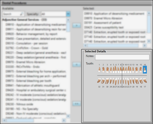 Selected Details - When you choose a dental procedure from the Selected section of the window, the Selected Details section shows you the options for customizing the procedure for this group. Your options depend on the mouth / tooth area assigned to the procedure in your Dental Procedures editor. For example, a procedure assigned to the Tooth area will show you a tooth chart, and you can choose a specific tooth to be assigned to this procedure. Regardless of the assigned area, you can always include Notes for any procedure.