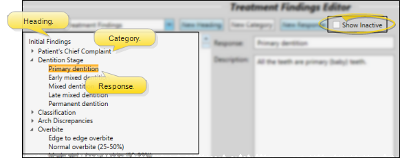 - Your findings records are sub-divided into a hierarchy of Headings, Categories, and Responses. You may expand or collapse folders as needed to help you find the record you want to work with. In addition, you can enable / disable the Show Inactive option to show / hide the inactive records in the list.