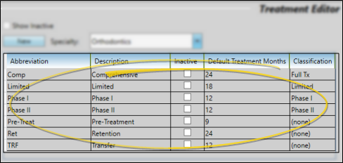 Default Months - Enter the number of months this phase of treatment typically takes for a patient to complete. This number is used when creating contracts, and to calculate the expected appliance removal date on the Findings pageof the patient folder.