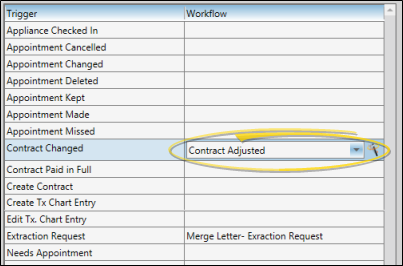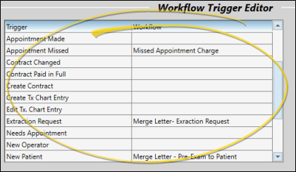 Appointment Triggers - Use appointment workflow triggers (Canceled, Changed, Deleted, Kept, Made, Missed) to activate workflows whenever patient appointments are processed in a specific way, regardless of the procedure. Appointment workflows are triggered only through the appointment processing function: They are not triggered when you use drag & drop to change an appointment, or when you change the appointment status from the patient's Appointment History. (You can also trigger procedure-specific workflows with the Appointment Procedures / Types editor.)