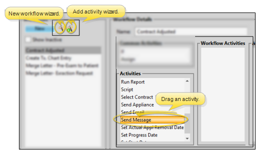 When you use the Workflow Wizard icon to create a new workflow, you are immediately prompted to select the activity you want to trigger. You can also add activities to a workflow by either using the Add Activity wizard, or dragging items from the Activities list into the Workflow Activities section of the window.