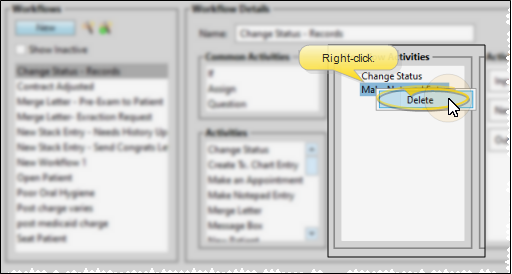 Right-click an item in the Workflow Activities list, and select Delete (or, click the activity and press the Delete key on your keyboard). You cannot delete workflows themselves, but you can flag workflows you no longer use as Inactive.