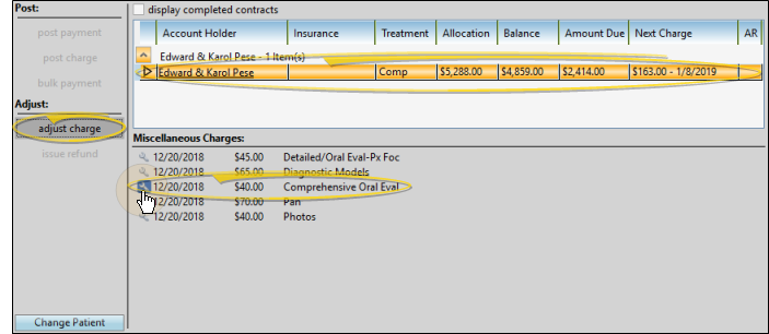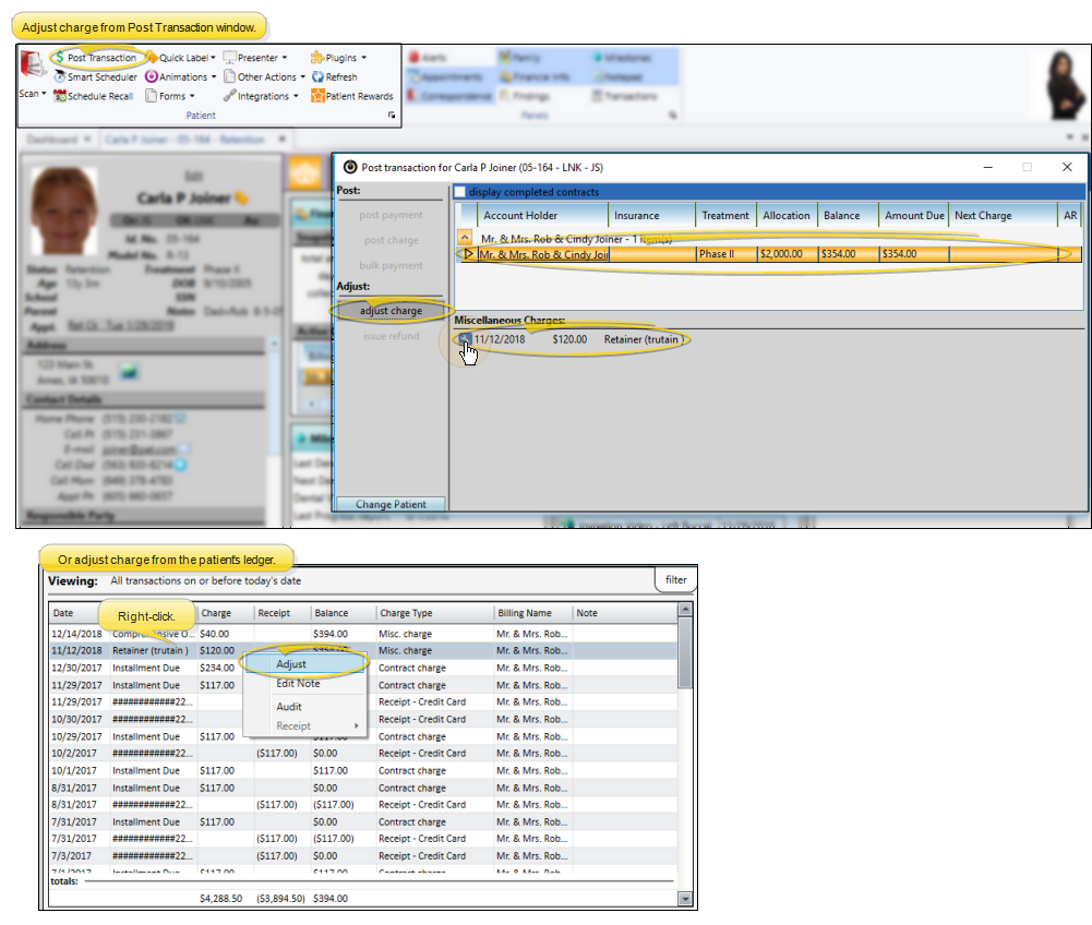 - You can either open the post transaction window for the patient and select the Adjust Charge action, then click the icon beside the charge you want to adjust, or, open the patient's transaction ledger, right-click the charge, and select Adjust.