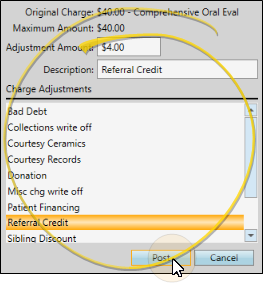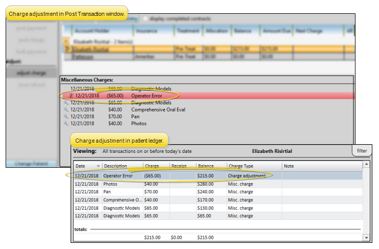 - The Adjust Charge window prompts you for the adjustment amount and description. Enter the amount you want subtracted from the original charge. For example, to reduce a $50 Initial exam charge by half, enter the adjustment amount of $25. Then, select a description from your Charge Adjustments list, or type a description. All descriptions with classifications other than "Operator Error" will appear on the patient's statement. Typed descriptions are not added to your list, but used for this transaction only. See "Transaction Adjustments Editor" for details about creating your standard list of adjustment descriptions.