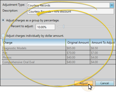 In addition, you can enable the Adjust Charges Individually option, and enter the amount to subtract from individual charges in the Amount To Adjust column. You can adjust charges individually after applying a percentage, retaining the percent reduction for all other charges. However, if you adjust charges individually, then apply a percentage, any individual adjustments are overwritten by the calculated percentage.
