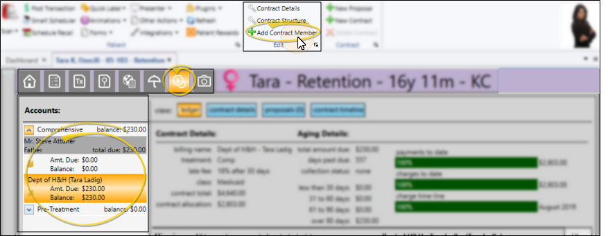 Open the Add Contract Member Editor - Open the patient's Finance page. Choose the contract to work with at the left of the window, then select Add Contract Member from the Edit section of the Patent ribbon bar.