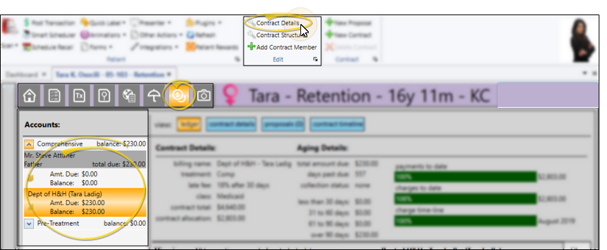 Open the patient's Finance page. Choose the contract to work with at the left of the window, then select Contract Details from the Edit section of the Patent ribbon bar.