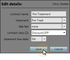 Use the Contract Details editor to assign a late fee policy, class(es), and statement due date of your patients' contracts, and in rare cases, to change the treatment phase associated with the contract.
