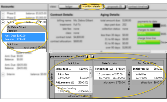 Enable the Details option at the top of the Finance page of the patient folder, then use the bottom half of the window to review and compare payment schedules for all parties in the selected contract. You can change the level of information that you see, but you cannot edit payment schedules from this window. See "Patient Finance Page" for details.