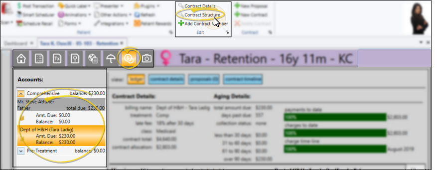 Open the patient's Finance page. Choose the contract to work with at the left of the window, then select Contract Structure from the Edit section of the Patent ribbon bar.