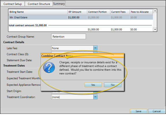 Combine Contracts Prompt- When you create a new contract, and a partial contract exists for a different treatment phase, you are prompted to combine the contracts at that time. If you do not do so, you cannot later choose to merge them.