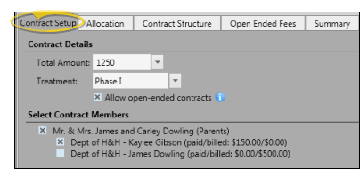 Use the Contract Setup tab to enter the total contract amount, treatment phase, contract members, and whether you are creating an open-ended contract.