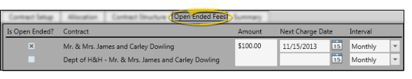 (You must have enabled the Allow Open-Ended Contracts option on the Contract Setup tab for this tab to be available.) Enable the Is Open Ended option for the billing party you want to work. Then, enter the amount to charge out at each interval, the date to start charging, and the time interval (monthly, quarterly, etc.). These fees are in addition to any total contract fee amount you allocated to this party.