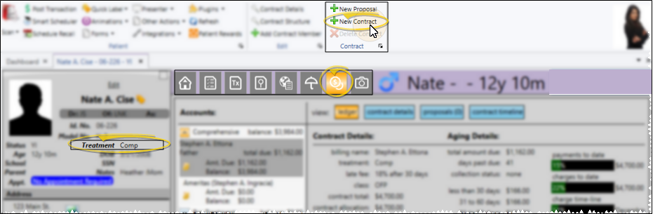 Open the patient's Finance page, and verify that the correct treatment phase is selected on the Patient Information Panel. Then select New Contract from the Contract section of the Patent ribbon bar.