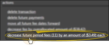 Increase / Decrease Future Period Fees - When the payment schedule is out of balance (often due to removing or adding too many fees or reallocating the contract), you can click this action to spread out the difference among all remaining scheduled period fees. Of course, if there are no future period fees, this option is not available.