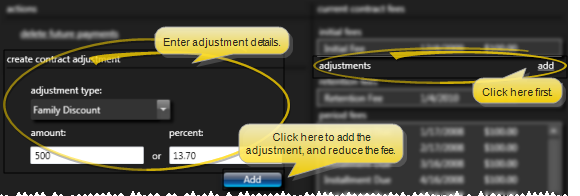 To apply a non-production adjustment, click add in the adjustments section of the window (or click an existing adjustment, if there is one). Select the adjustment type and specify the dollar amount or percentage of the fee to apply. Then click add. Although you enter a positive amount, the fee schedule is reduced by the adjustment amount. The date of the adjustment is automatically set to today: Your security settings (Office Financial > Modify Contract Adjustment Dates) determine whether you are allowed to change the date.