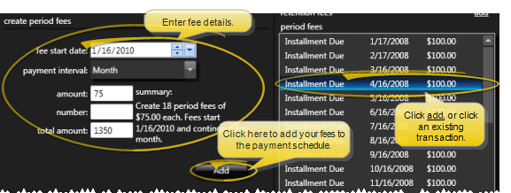Add Period Fees - Enter the date the first fee in this series should be due, and the payment interval. You can then enter two of the three payment details: The dollar amount, number of payments or total amount for this payment series. The remaining field is calculated automatically, showing you a summary of the transactions that will be created when you click add. If the calculations do not work out evenly, you can either enable the apply remainder to final payment option, or disable the option to add one more payment to the end of the period fee schedule.
