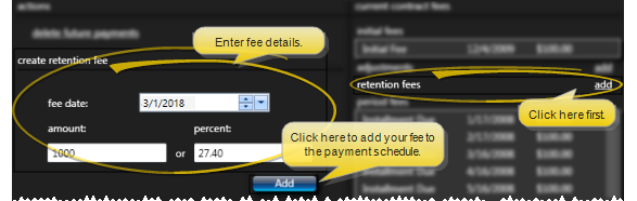 Add Retention Fees - Enter the date the fee will be due, and either the dollar amount or the percent of the Contract Portion to charge. Then click add.