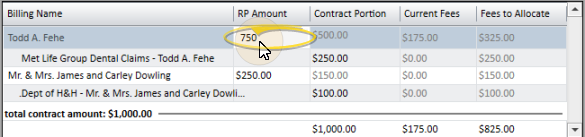 - You can manually adjust the total contract fee among all contract members by entering the amounts in the billing grid at the top of the window. Click the name of the contract member you want to work with, then enter the appropriate amounts.