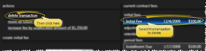 Delete an Individual Payment - Click a payment, then click the delete transaction action. You might delete a transaction if, for example, you applied an adjustment and need to reduce the number of period fees to charge. Or, you might delete a transaction that was entered in error so that you can add the appropriate fee to the schedule.