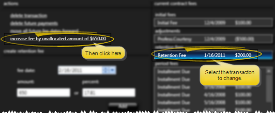 Increase / Decrease Individual Fee by Under / Over Allocated Amount - When the payment schedule is out of balance (often due to removing or adding too many fees or reallocating the contract), you can easily increase or decrease an individual transaction to absorb the difference by selecting the transaction to change and clicking this action.