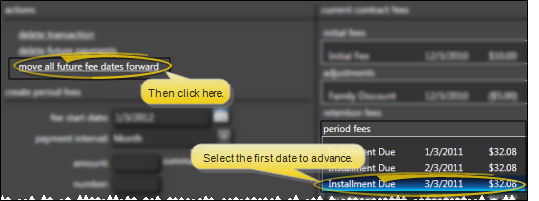Move All Future Fee Fates Forward (Place contract on "hold") - Click the first transaction to work with, then click the move all future fee dates forward action and enter the number of months to increase each subsequent fee date, regardless of the fee type. In other words, if you choose to move an initial fee transaction forward, all retention fees and period fees that fall after the date of that initial fee will also be moved forward. This feature is especially useful for placing contracts on "hold" for a certain period of time.