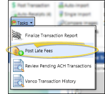 - Select Tasks from the Financial section of the Home ribbon bar, and choose Post Late Fees to open the pending late fees window.