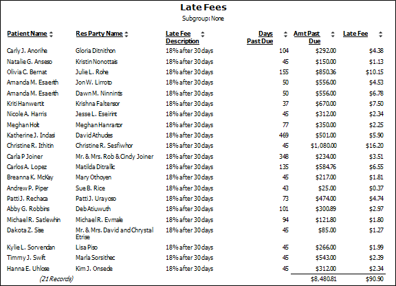(Optional but highly recommended.) Run the Late Fees report to obtain a list of accounts with late fees ready to be posted. The report includes both the patient and the responsible party names, late fee policy description, number of days the account is past due, the total amount past due, and the amount of the pending late fee. Once late fees are posted to your accounts, they no longer appear on this report. See "Late Fees Report" for details