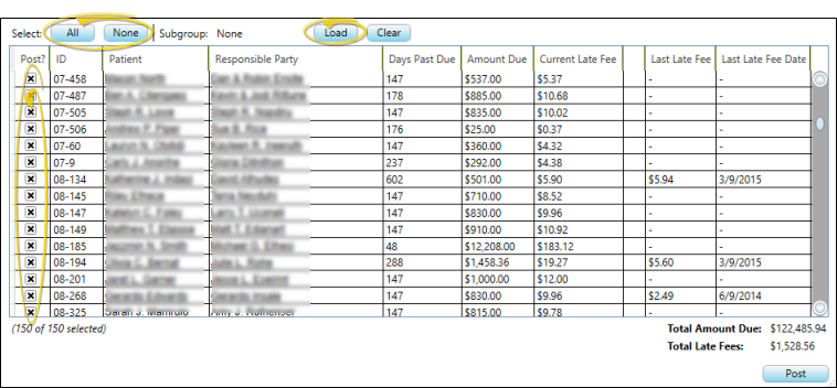 Subgroup Option - Click Load, then select a subgroup of patients to include in the late fee list. Be sure that at some point you view the late fee list for all patients to be sure all fees are being applied appropriately.