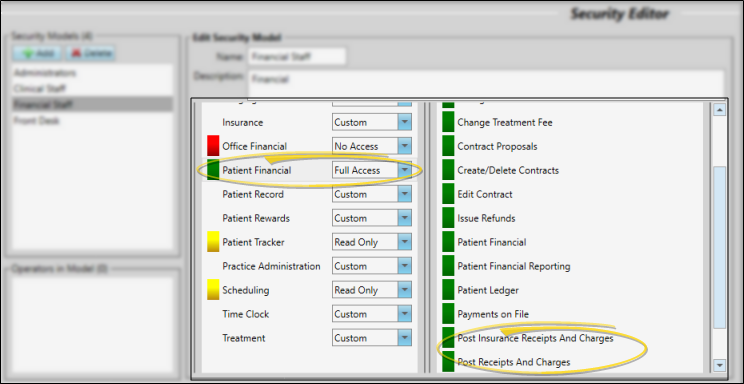 - Your Edge Cloud security settings can allow or prevent operators from posting transactions. To set up this security access, open the Security editor and choose the security model to work with. Then click the Patient Financial security group, and set the Post Insurance Receipts and Charges and Post Insurance Receipts and Charges options to the appropriate access settings. (See "Security Editor" for details about using the editor.)