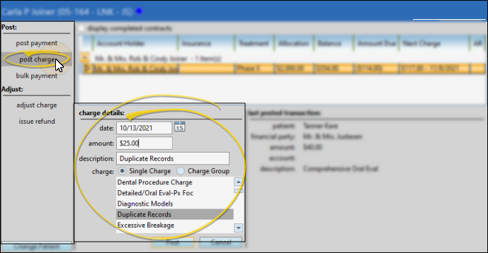 noteIf the charge is for a dental procedure, and not an orthodontic miscellaneous charge, be sure to select from your Dental Charge Types editor. This will flag the charge as a Dental Charge on the patient's ledger.