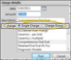 noteAlthough you post a charge group as a single transaction, the individual charges in the group will appear in the patient's ledger and on your Transaction Report. You cannot change the amount when you post a charge group. See "Miscellaneous Charge Editor" for details about creating your charge groups.