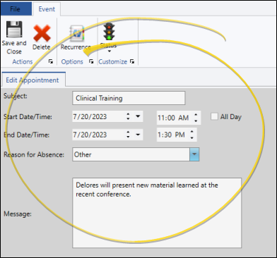 Message / Notes - Type a full description of the appointment or event in the box at the bottom of the window. These notes will be displayed in the tooltip that appears when you hover over a scheduled appointment.