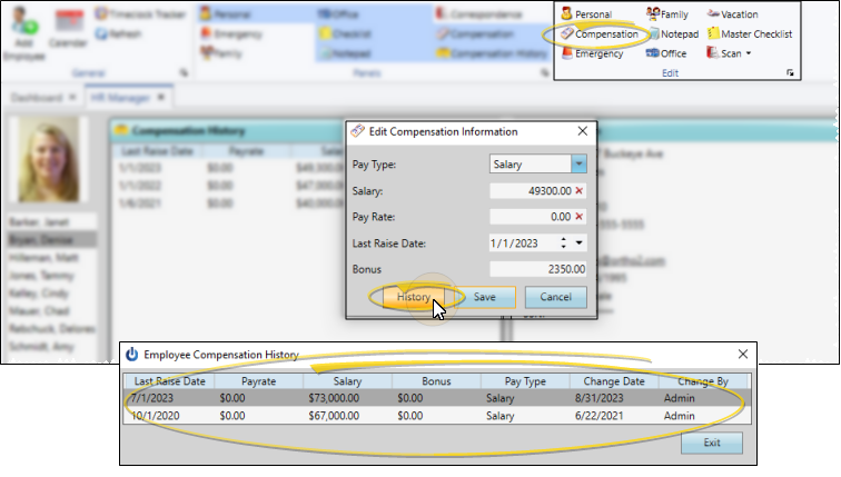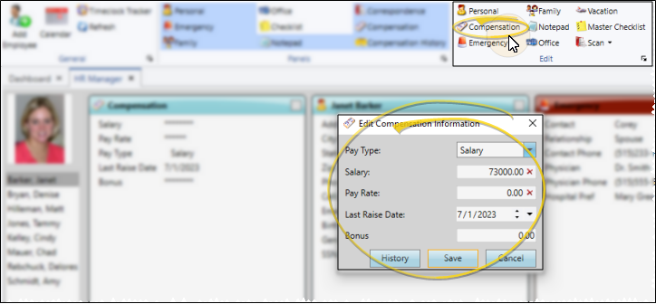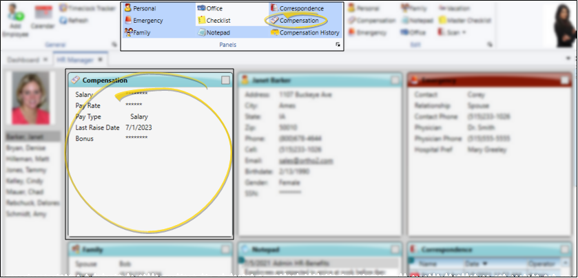 Enable the Compensation option from the Panels section of the HR Manager employee record to include that portion of the record on your screen. You will notice that the salary / hourly pay rate and bonus are not displayed. This prevents unauthorized persons from viewing sensitive information. You must choose to edit the panel to view these details.