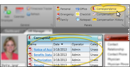 Your HR Manager employee records include a Correspondence panel that keeps a copy of all mail merge documents you have generated for the employee, as well as documents you drag or scan into the record.