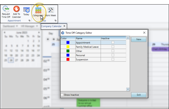 Use the Category editor of your HR Manager calendar to create a list of categories to assign to your calendar appointments and time off requests.