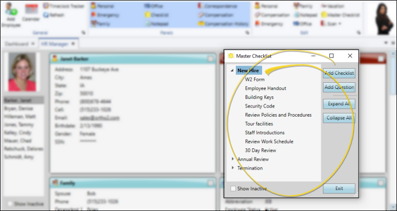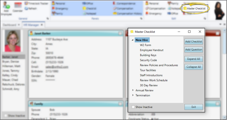 Use the HR Manager Master Checklist editor to create checklists you can use to track employee progress and compliance as they complete the steps required for hiring, orientation, evaluations, termination, and more.