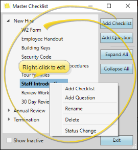 Add a Checklist - Right-click anywhere in the editing window, or click Add Checklist and type the name of your new list. New checklists are added to the bottom of your Master Checklist editor, but appear in alphabetical order in your HR Manager employee records.