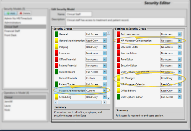 Select the Practice Administration security group to set up the access for your HR Manager data and settings. You can choose Full Access for the entire security group to allow this security model full rights to all practice administration areas of your Edge Cloud system, including HR Manager settings and data, or choose Read Only or No Access to limit access to this type of data. Or, choose Custom to choose individual practice administration access, including these HR Manager settings: