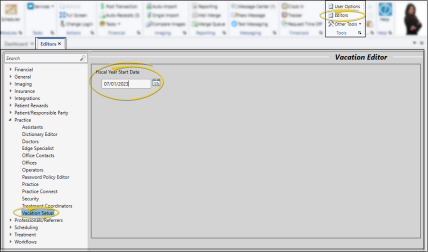 Select Editors from the Tools section of the Home ribbon bar. Then, from the Practice section, open the Vacation Setup editor. (You can also use the Search field to look for the editor you want to work with.) Then confirm that the start date reflects your fiscal year. This date is necessary for calculating annual accruals, maximum accruals, and carryovers for your employees. Once set, this date generally does not need to be changed.