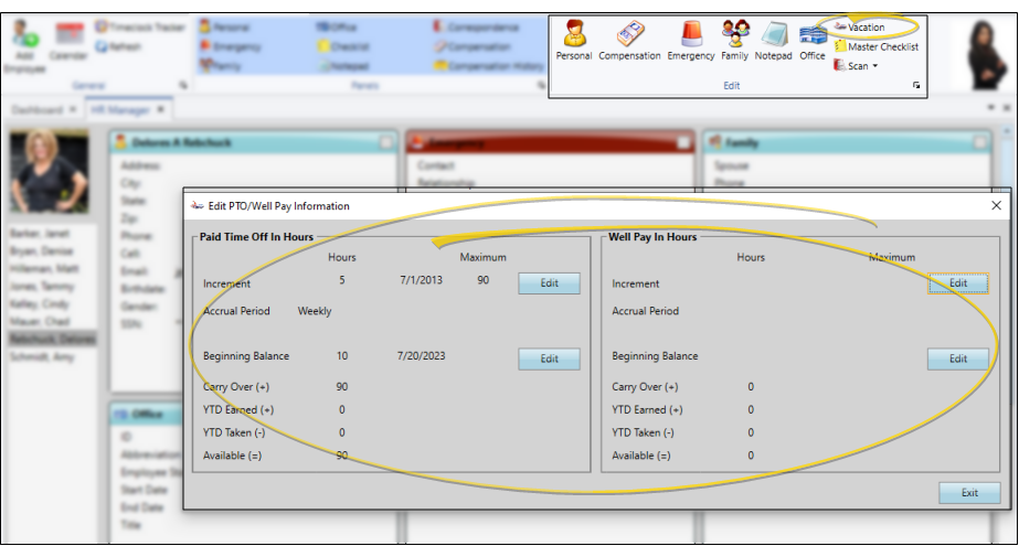 With theHR Manager Employee Record open, select Vacation from the Edit section of the ribbon bar. This editor must be set up for each employee individually.