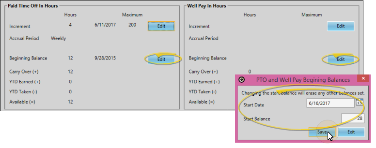 To apply previously-earned hours to an employee record, click Edit beside the Beginning Balance field of either the Paid Time Off or Well Pay section of the window, depending on which type of rate you wish to work with. Then enter the date you are applying the balance, and the number of earned hours. Then click Save to save your changes.