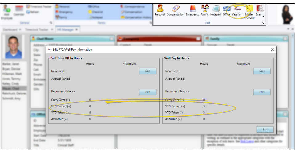 The bottom of the PTO / Well Pay window details the hours accrued, taken, and available to the employee. The hours taken are calculated from timeclock entries flagged as "Vacation", which affects Paid Time Off hours, or "Sick", which affects Well Pay hours.