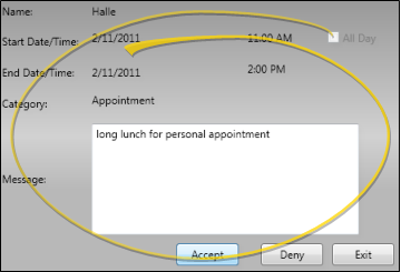 Click to Accept or Deny the request. Accepted requests become scheduled events in your HR Manager calendar. Denied and deleted requests remain in the queue for future reference. When an employee's time off request has been either accepted or denied, that employee receives a notice of the decision via the Message Center or Messaging widget. See "Edge Cloud Message Center" for details.