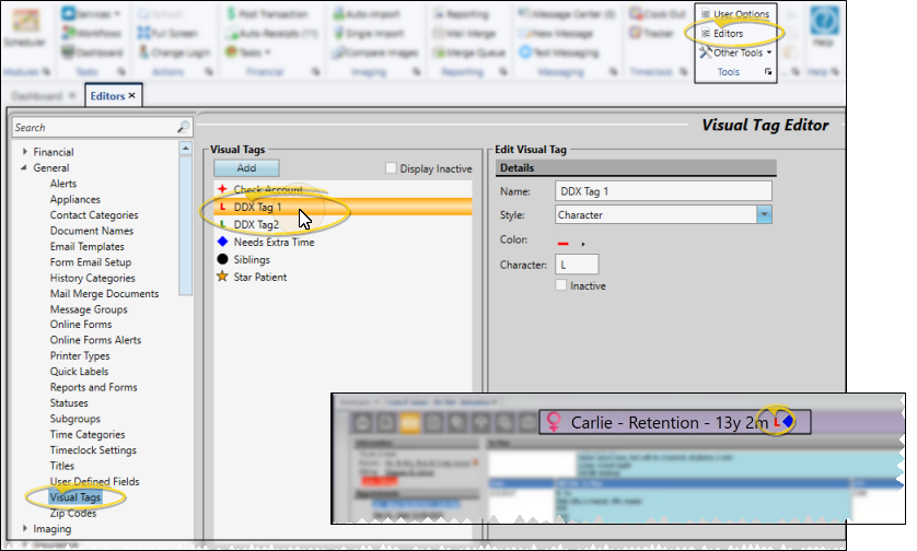 DDX uses Edge Cloud visual tags to identify patient DDX case status. While the tags are added to your Visual Tag editor by DDX, you can modify the color and/or text of the tags to suit your practice needs.