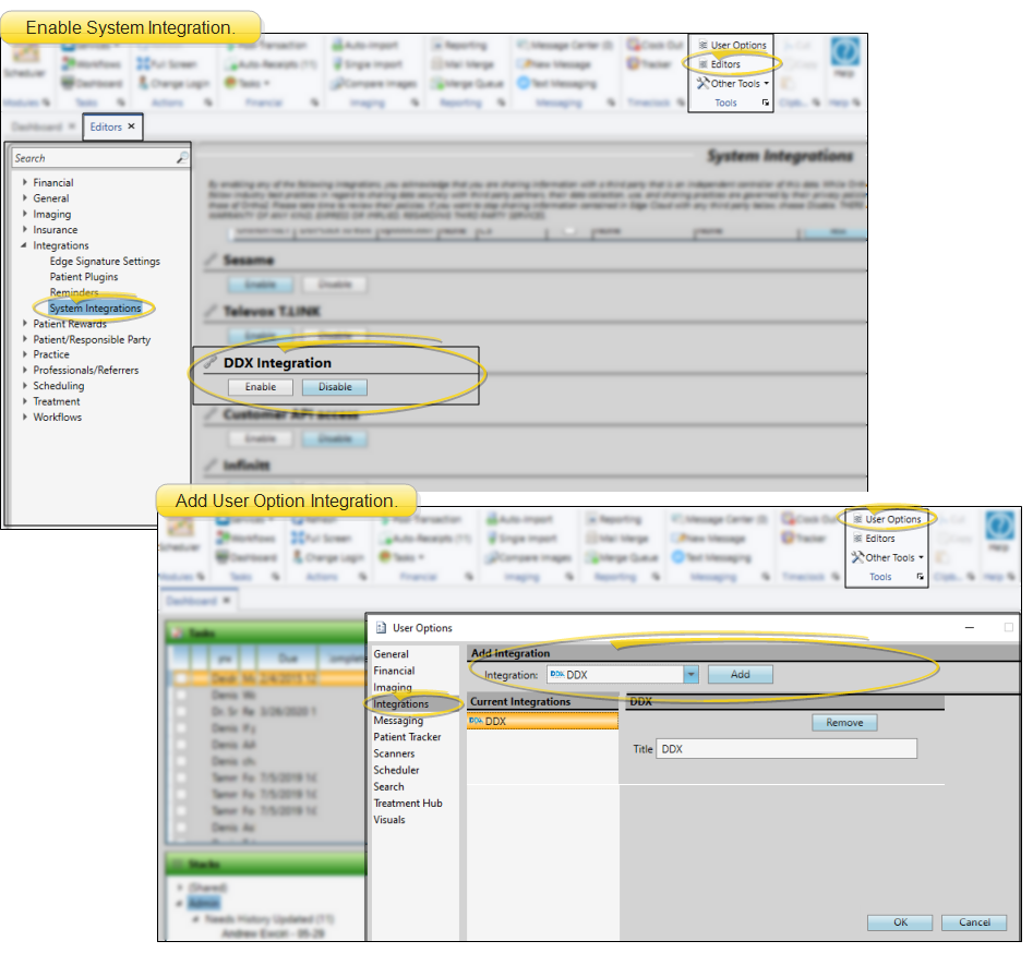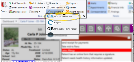 Open a patient folder in Edge Cloud. Select Integrations from the Patient section of the Patient ribbon bar, and select the DDX option to access or create the patient's DDX case. (Only operators that have added the DDX integration to their User Options have this feature. You can also access or create the DDX case by right-clicking the patient's appointment in your Scheduler.