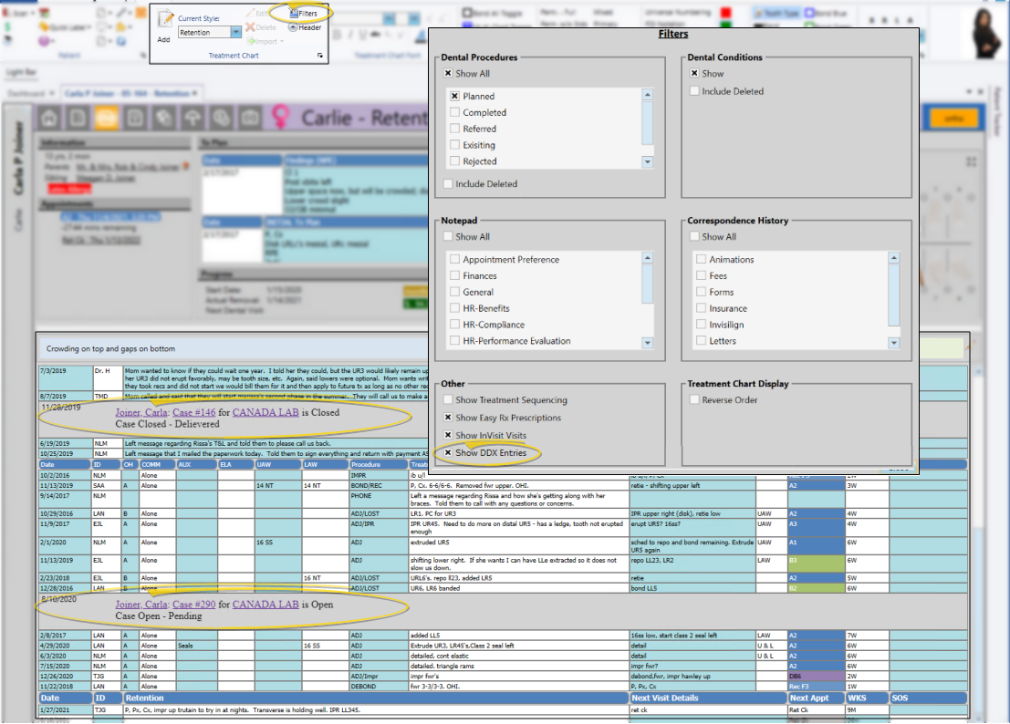 Use the Filters icon in the Treatment Chart section of the Patient ribbon bar to show / hide the patient's DDX cases within the patient's treatment chart records. See "Treatment Hub" for details.