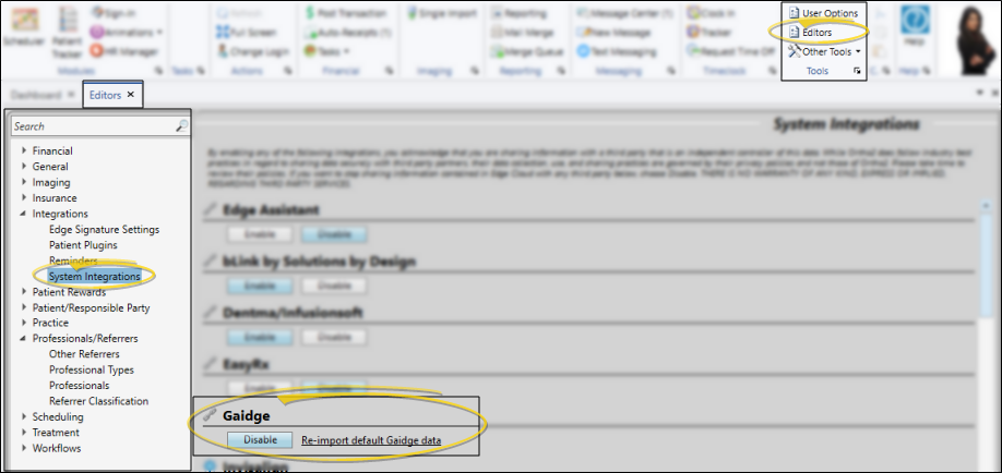 Enable the Gaidge integration in your System Integrations editor to connect your Edge Cloud practice data with your Gaidge practice performance analysis system, and automatically add standard Gaidge responses to your Contract Classes, Start Origin, and Treatment Classification editors. If you later disable the integration, the responses are not removed from the editors.