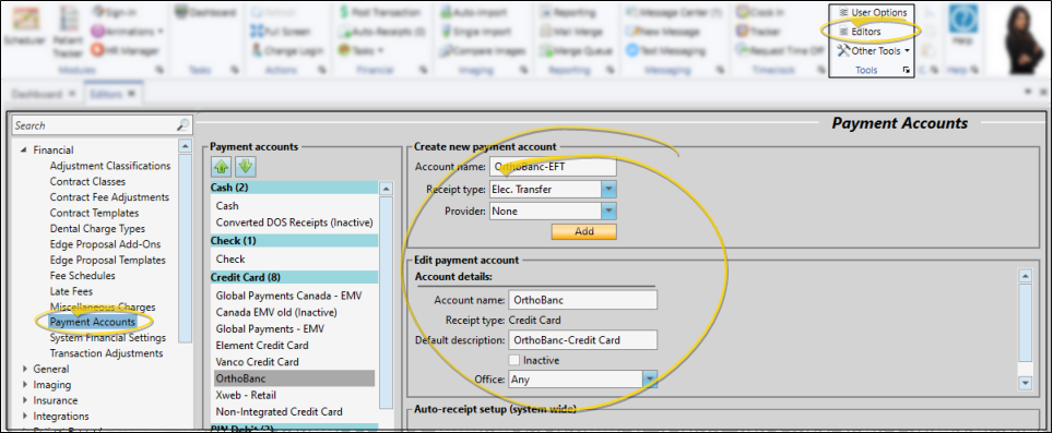 To prepare Edge Cloud for OrthoBanc deposits, create one or more payment accounts to track those transactions. We suggest you create an "OrthoBanc" payment account with the receipt type "Credit Card" or "Electronic Transfer", (or create one of each) with "none" as the provider in your Edge Cloud Payment Accounts editor, because the transactions re processed outside of the Edge Cloud system.